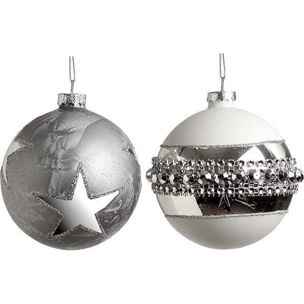 Γυάλινες Μπάλες χριστουγεννιάτικες σε δύο εξαιρετικά σχέδια και χρώματα, ασημί ματ με γυαλιστερό αστεράκι και λευκή με ανάγλυφα ασημί διακοσμητικά.