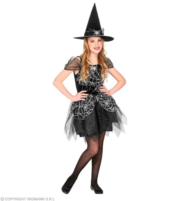 Παιδική Αποκριάτικη Στολή Μάγισσα Μαύρο/Ασημί Ιστός Αράχνης. Περιλαμβάνει το φόρεμα και το καπέλο.